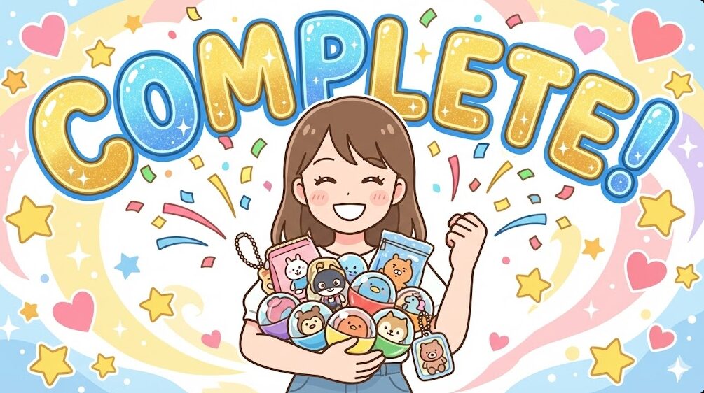ちいかわガチャガチャ2月新作をコンプリートして喜ぶファンのイメージ