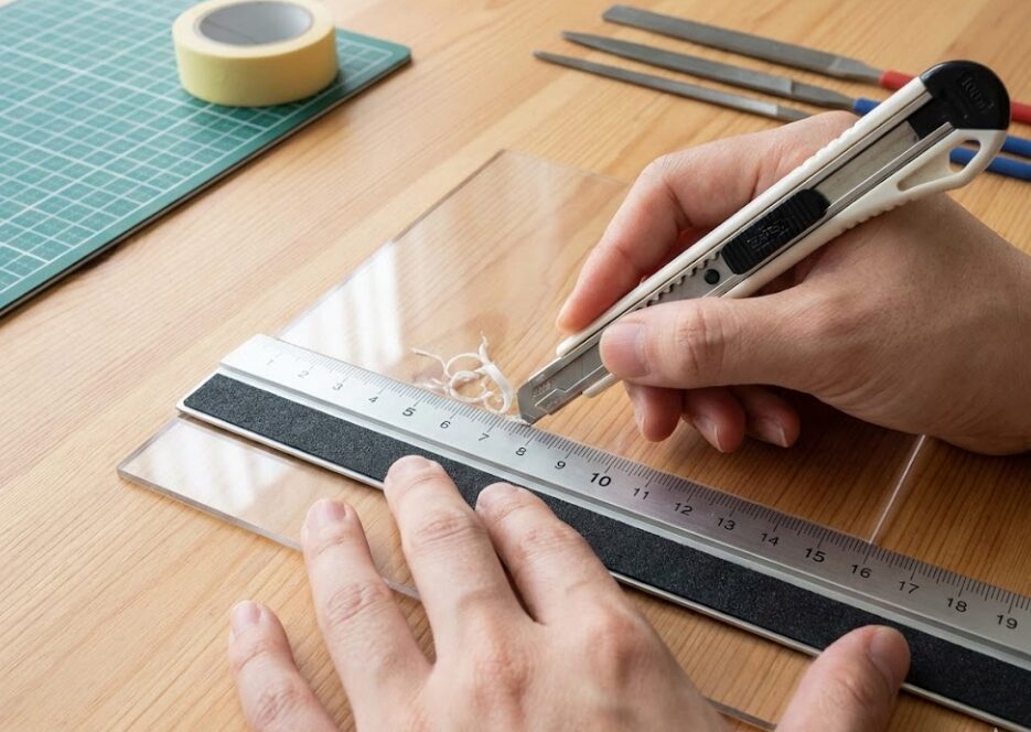 アクリル板のように硬くて脆い素材は、普通の刃物を無理に押し込むと、力の逃げ場がなくなって「パキッ」と予期せぬ方向に割れてしまいます。プラスチックカッターはこの問題を解決します。使い方のコツは、一度で切ろうとせず、定規を当てて手前に何度も軽く引き、V字型の溝を深くしていくことです。板厚の3分の1から半分程度まで溝が掘れたら、平らな作業台の端に溝を合わせ、上から軽く力をかけて「折る」のが正解です。この「削って折る」プロセスを踏むことで、まるでレーザーカットしたかのような直線的な断面が得られます。