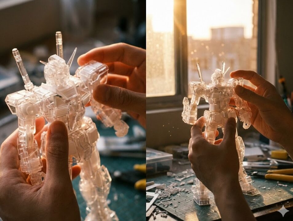100均のニッパーを使い、一度ではなく「二度切り」を行う。ゲート(余分な部分)をわずかに残し、最後にデザインナイフやヤスリで丁寧に削り落とす。この、他人から見れば非効率的で無意味に見える「こだわり」の中にこそ、ホビーの本質が詰まっています。断面を指でなぞり、段差が完全に消えていることを確認した瞬間の悦び。光にかざしても白化が見えない、完璧な透明感。その「自己満足」の積み重ねが、最終的に完成した作品に圧倒的なリアリティと説得力を与えるのです。