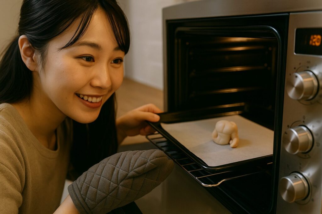 また、焼成を一度で終わらせず、**2段階焼成(プリベイク+本焼成)**を行うと、内部と外部の温度差が小さくなり、ひび割れ防止に効果的です。プリベイクでは約100℃で10分程度加熱し、全体の安定化を図ってから本焼成に移行します。