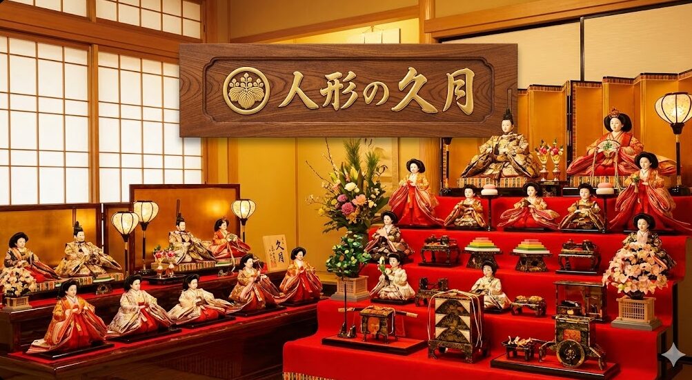 人形の久月のロゴや伝統的な雰囲気が漂う、高級感あふれるリカちゃん雛人形の展示風景。