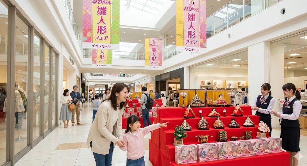 ショッピングモール(イオン風)の特設会場に並ぶ雛人形と、それを見つめる親子。
