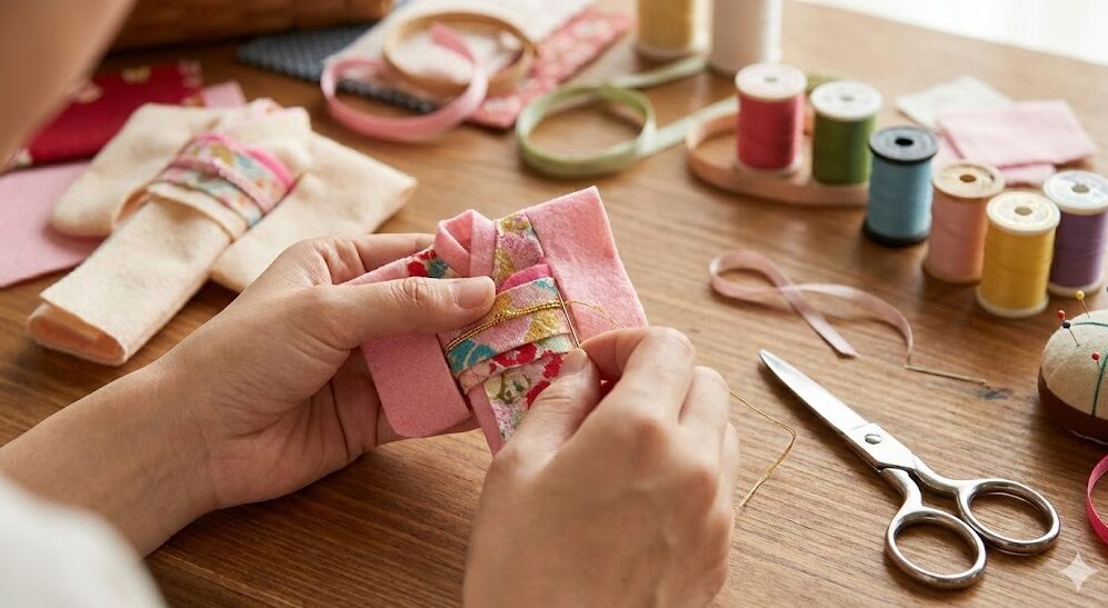 フェルトや布を使ってリカちゃんの着物を手作りしている手元のアップ。裁縫道具。