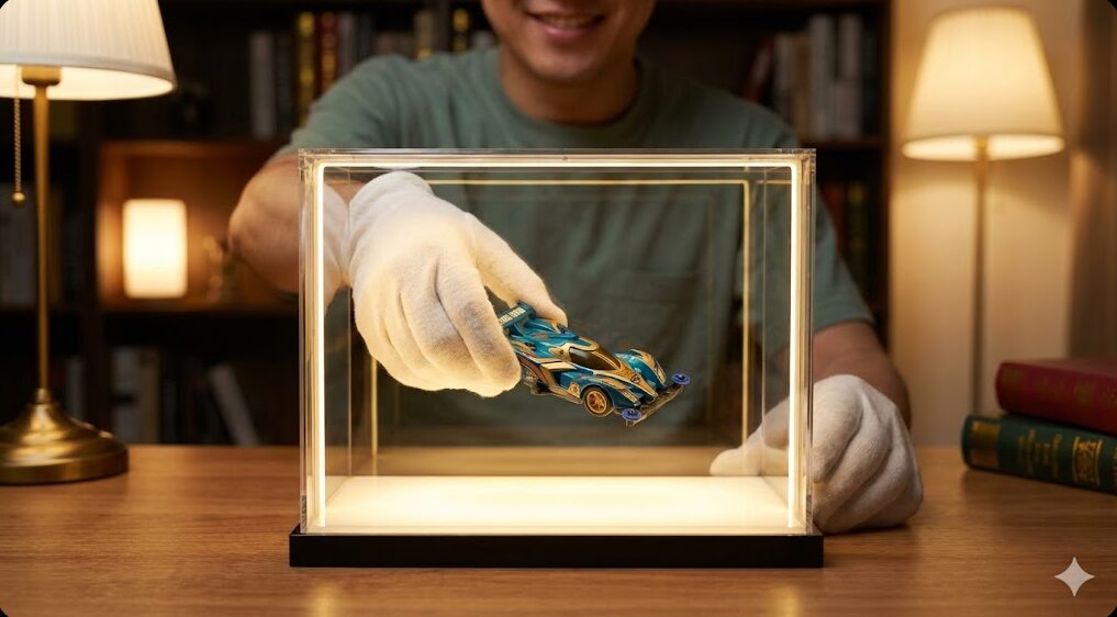 2. UVカットケースの導入 パッケージ(箱)の美しさを保つのもコレクターの嗜みです。ライジングバードの箱は、ミニ四駆ファンにとっても思い入れの深いデザインになるはず。箱ごと飾る場合は、UVカット機能付きのアクリルケースを使用することで、色褪せを最小限に抑えられます。